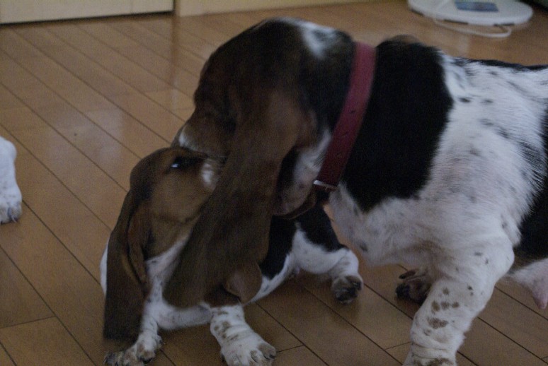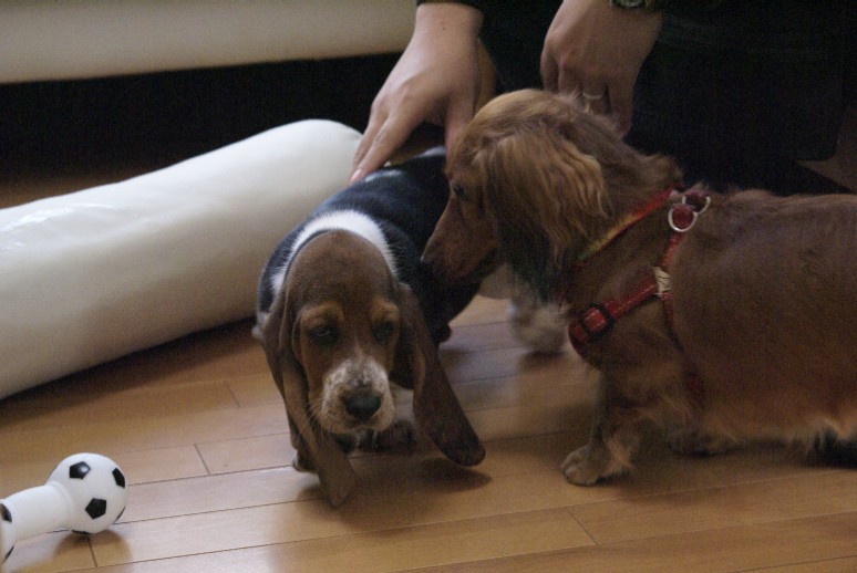 我が家もロイが来た日、グートが来た時は先輩犬のノワとダーラが怖がって怖がって、仲良くなれるかなぁ~と本気で心配していました^^;